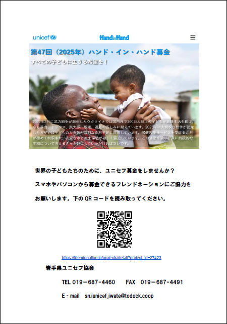 標記の取り組みは1979年の国際児童年にはじまり、今年で47回目を迎えます。毎年11月〜12月をハンド・イン・ハンド募金キャンペーン期間とし、本年は、「すべての希望を生きる子どもに!」をテーマに、ユニセフを支援してくださる全国のみなさまが、街頭やイベントで、職場や学校で、またご家庭の中で、工夫を凝らしてユニセフ募金活動に取り組みます。岩手県ユニセフ協会(滝沢市土沢、公財:日本ユニセフ協会協定地域組織)も、「ハンド・イン・ハンド募金2025」について、12月13日に花巻市、12月14日に盛岡市、12月20日に二戸市で街頭募金に取り組みます。