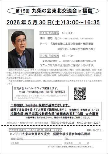 平和憲法・9条をまもる岩手の会(事務局:岩手県生協連・県消団連)は、来る2026年5月30日(土)に福島県で開催される標記の交流会がオンライン参加を基調とすることを受けて、盛岡市内の県高校教育会館において、大画面で視聴することにしました。この交流会は東北地区の各県の九条の会が持ち回りで担当。今年は福島県が担当県です。当日は、九条の会事務局の渡辺 治 一橋大学名誉教授が、「高市政権による9条改憲・戦争準備の企てにいかに立ち向かうか」をテーマに講演するほか、東北の各県の九条の会の取り組みを交流しあいます。