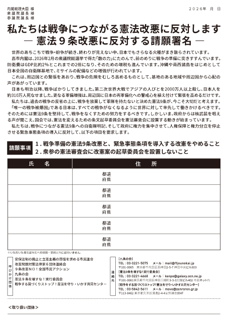 高市政権の下で、戦争準備のための憲法9条の改悪や、緊急事態条項の導入など憲法改悪の動きが急速に進んでいます。この危機に際し、従来から平和と民主主義、自由のために運動をしてきた6つの団体は、このほど、従来まで取り組んできた「大軍拡反対請願署名」に変えて「私たちは戦争につながる憲法改悪に反対します―憲法9条改悪に反対する請願署名(略称:憲法9条改悪反対請願署名)」に取り組むことを呼びかけました。これを受けて、「全国市民アクション 岩手の会」(賛同130団体)も、この新署名に取り組むことにいたしましたのでご案内します。